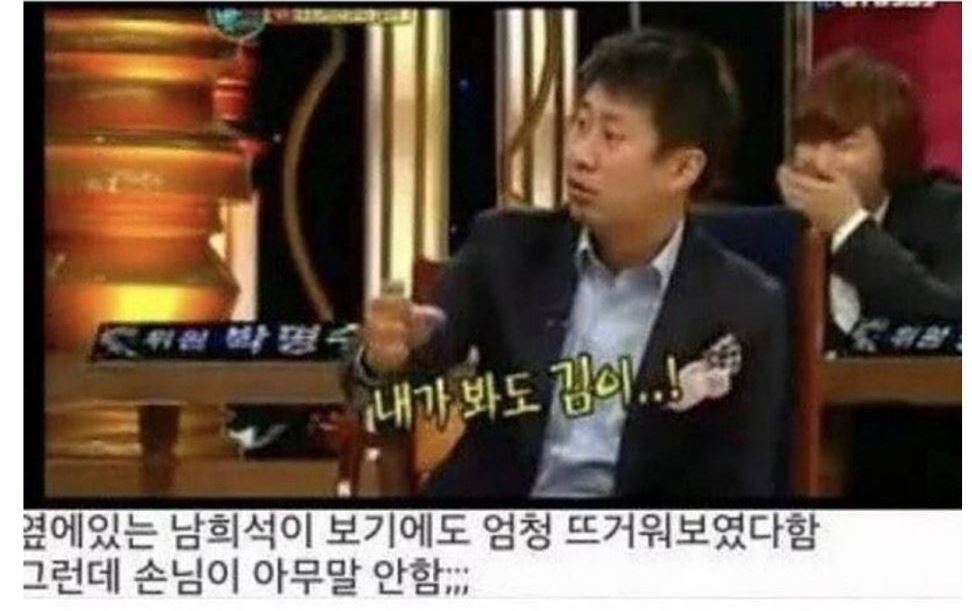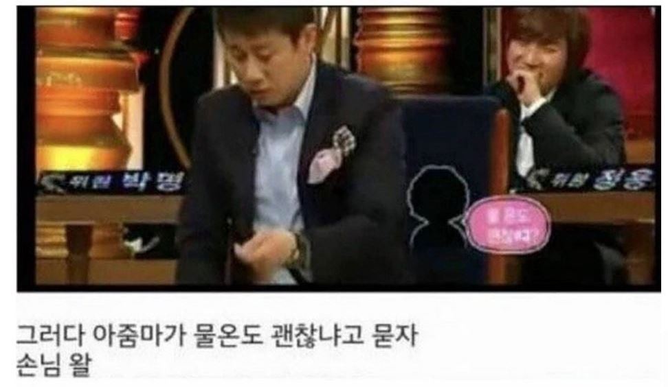 김이 모락모락 나는 게 누가봐도 엄청 뜨거운 물이었는데, 정작 그 손님은 아무말 안 하고 가만히 있었다고 ㄷㄷㄷ